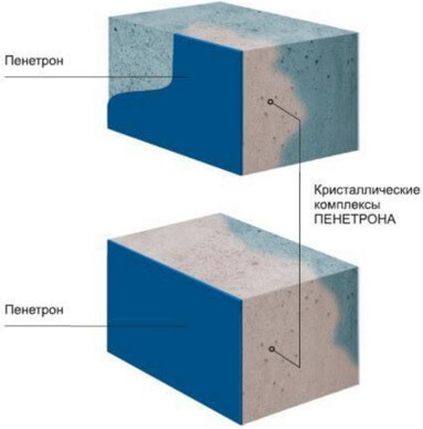 Внутри строительного материала активные вещества гидроизоляционного средства расщепляются в жидкости, присутствующей внутри бетона, тем самым взаимодействуя с ионами алюминия, кальция, а также с солями, оксидами металлов. Данные процессы способствуют развитию солей другого рода, вступающих в реакцию с водой, формируя таким образом нерасщепляемые кристаллогидраты. Они охватывают все свободное внутреннее пространство стройматериала, становясь с ним одним целым.