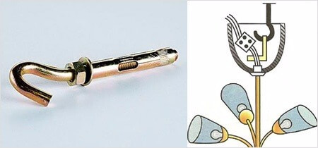Анкера используются для работы с прочными потолками из бетона, которые способны выдержать тяжеловесные осветительные приборы. Большую люстру более пяти килограммов вешают на анкерный крюк, просверлив перед этим отверстие нужного диаметра. Крепежный элемент имеет распорку, которая после установки разойдется в стороны и зафиксирует осветительный прибор.