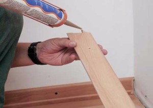 Декоративная планка подносится к бетону и сильно придавливается. Как обеспечить плотное прилегание плинтуса? Можно концы панели закрепить саморезами, если плинтус деревянный — шпильками, при отсутствии такой возможности, придавить материал к стене тяжелыми приспособлениями. Данный вид крепления отличается своими минусами:
